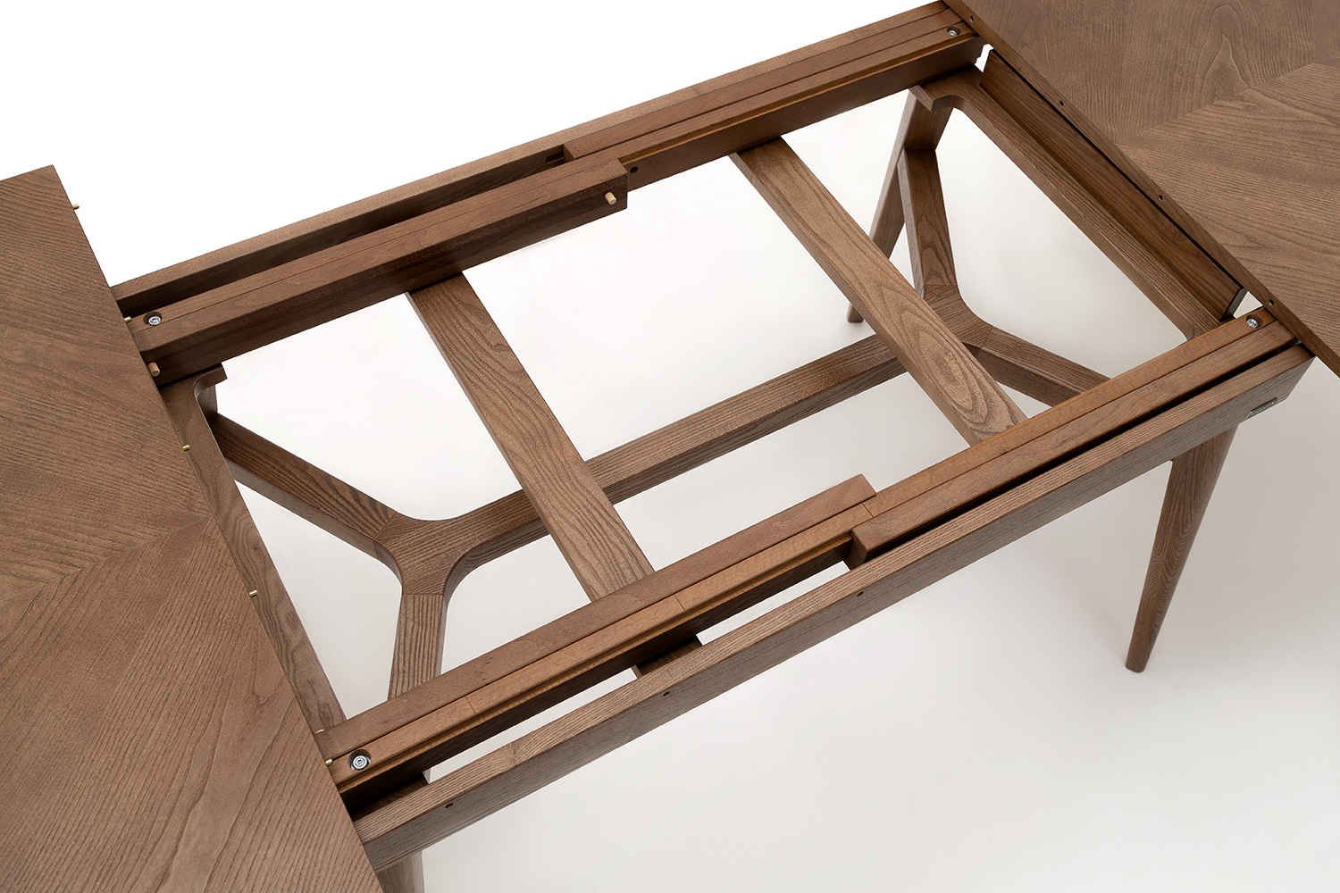 Эта система позволяет быстро трансформировать стол из компактного повседневного варианта в просторную поверхность для приема большой компании.