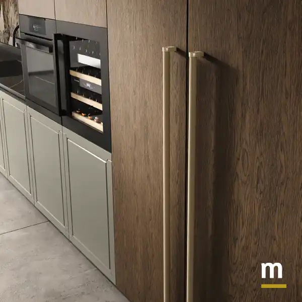 Островная часть со столешницей. Вместительные тумбы с двойным доступом и дверцами Myriad отличаются основаниями ящиков и корзин шириной 75 см. Доступны также с внутренними или внешними ящиками. Линия соединения между зоной мойки и островом — это столешница толщиной 6 см. Шпонированная дубом Moka, та же отделка используется для дверей шкафов.