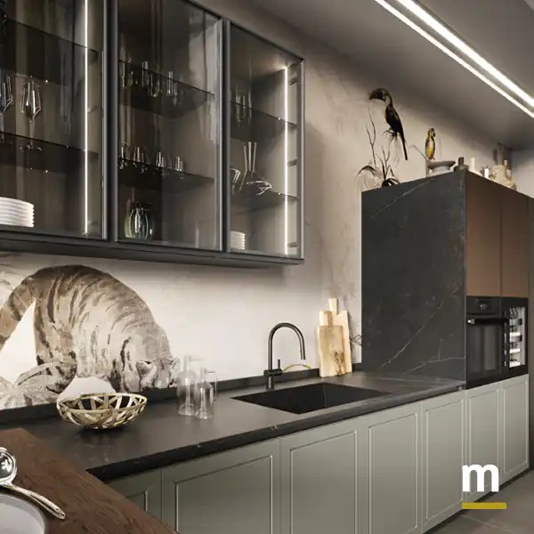 Навесные шкафы со стеклянными дверьми. Навесные шкафы в матовой черной отделке с дымчатым стеклом представлены корпусом цвета графит с текстурой. Видимые боковые панели выполнены в матовой лакированной отделке Pietra, повторяющей отделку дверей оснований. Все это дополняется полками из дымчатого стекла и внутренним освещением со встраиваемыми светодиодными профилями в боковых панелях.