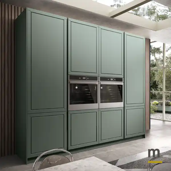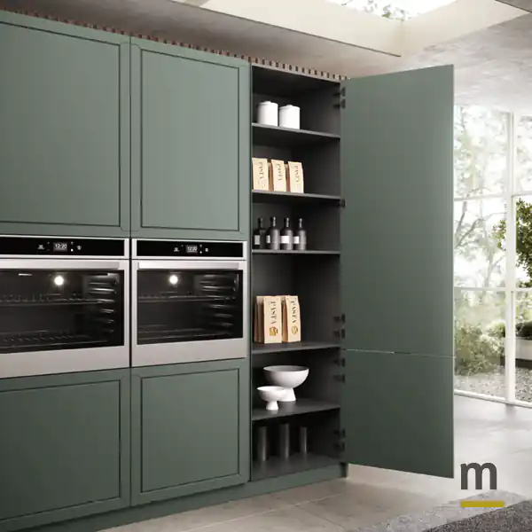 Ширина шкафа 75 см. Доступен как с плоскими дверцами, так и в варианте Myriad, всегда придает композиции динамику. Матовая лакированная отделка Muschio с цоколями и пазами гармонирует с дверьми.