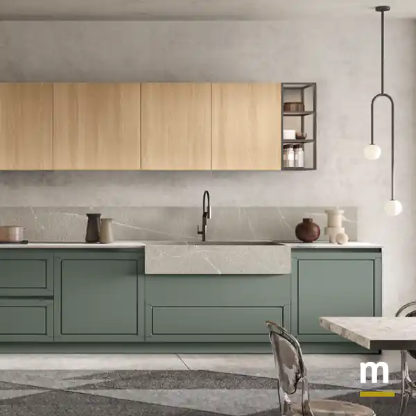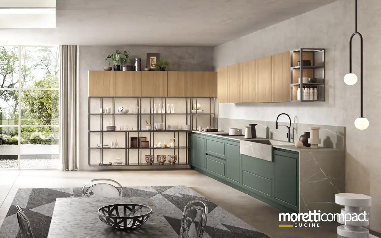 Новинка в серии компактных кухонь Moretti — блок раковины, выполненный в отделке Laminam Pietra Piasentina Grigio Fiammato. Теплые оттенки, такие как матовый лак Muschio и древесные элементы создают приятное ощущение естественности.