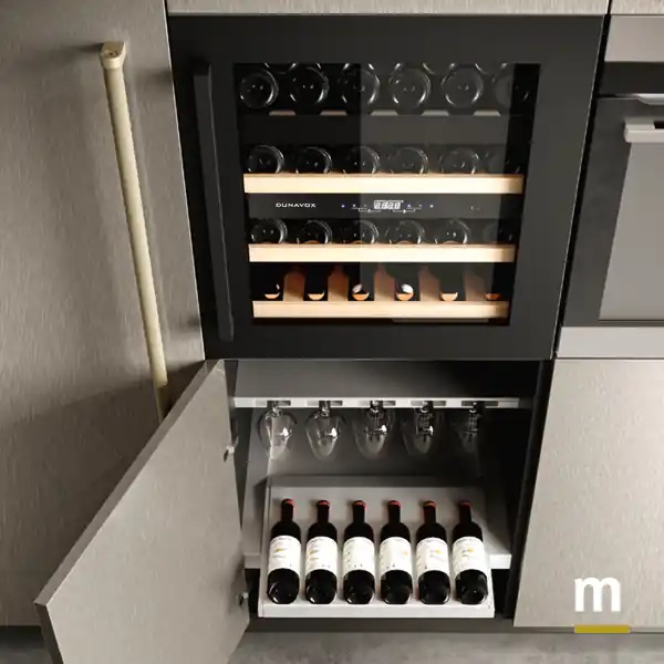 Полка под столешницей. Открытая полка из алюминиевой рамы, покрытой лаком Metal Gray, и съемными полками из дымчатого стекла со встроенной в подсветкой.