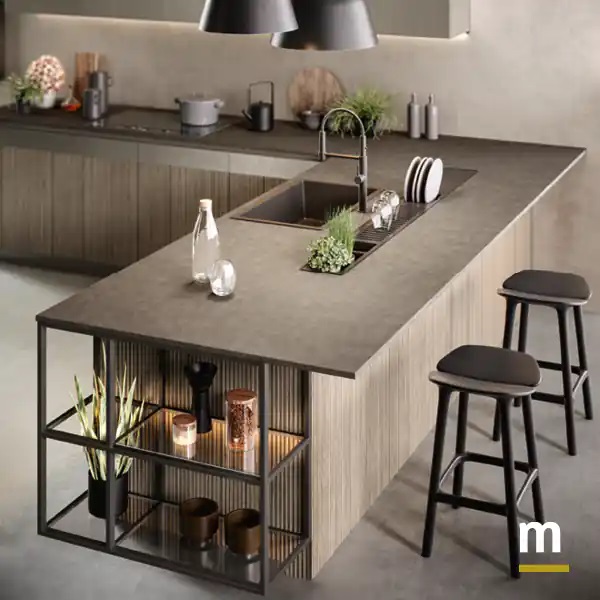 Полуостров с интегрированным оборудованным каналом в столешнице из HPL-ламината Peltro. Функциональное и эстетическое решение, предлагающее передовые возможности для персонализации рабочей поверхности.